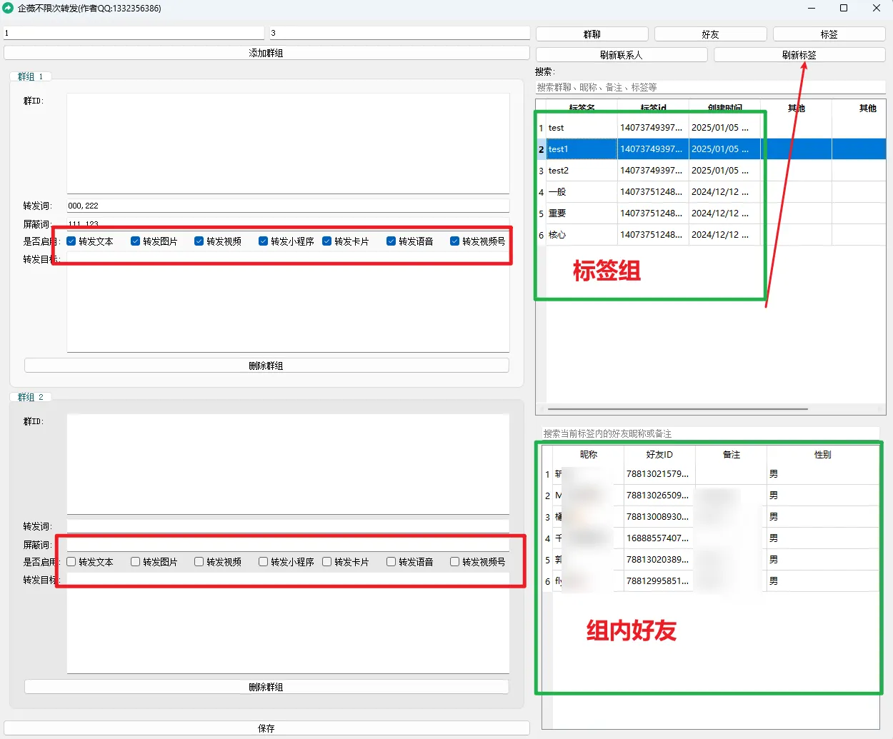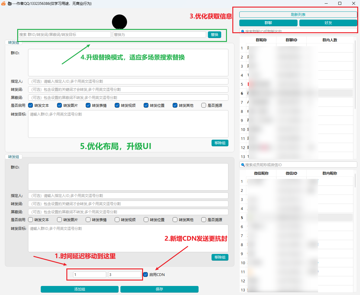 启薇转发以更新支持语音,视频,卡片,小程序。 并可以获取标签及标签下好友实现快速定位。此转发可以取代裙发,你可以设置监听一个人发来的消息然后转发(裙发)给你需要转发的人,这不就群发了???就是这样丝滑!! 看下图
