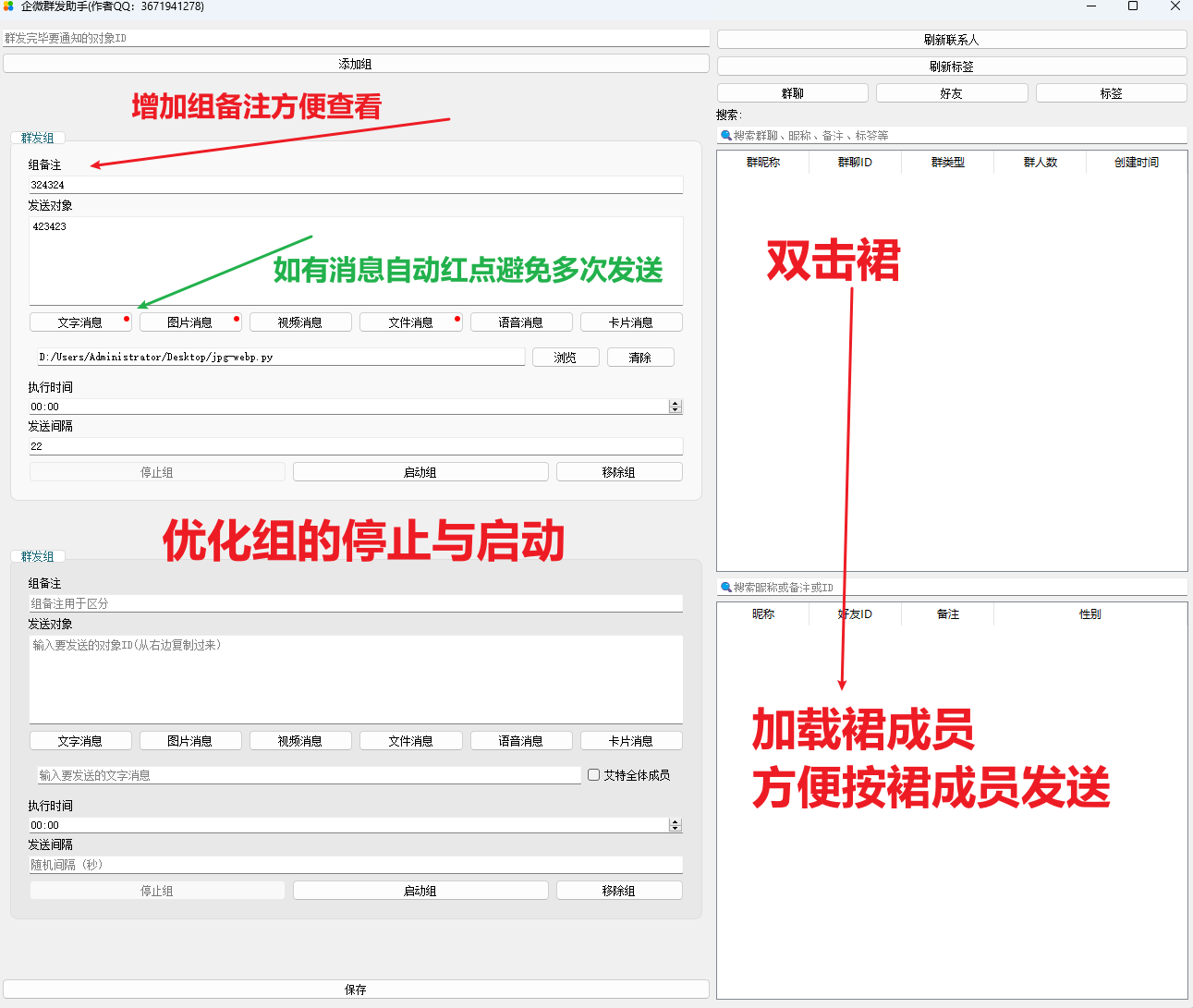 新增组备注/设置留痕避免重复发/新增裙成员发/频繁卡片发送策略