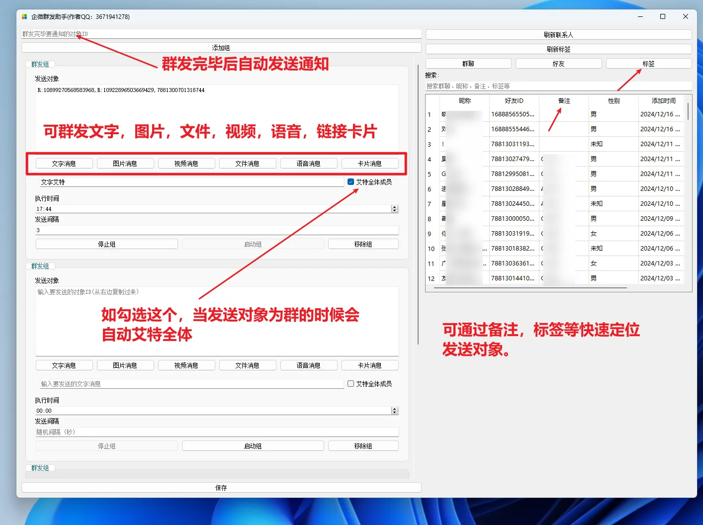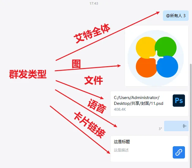 支持裙发语音,视频,卡片,文字,文件,图片。 并可以获取标签及标签下好友实现快速定位。正在使用的小伙伴可以找我免费更新!