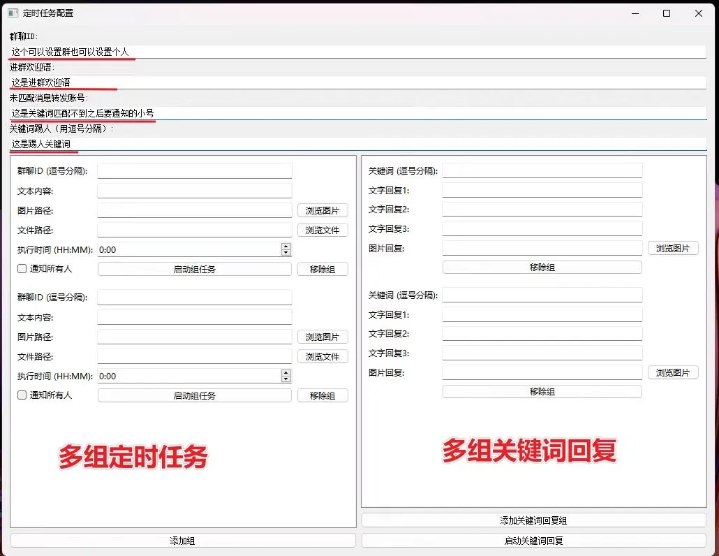 可以多组定时发文字/图片/文件/视频并选择是否@全体,自定义欢迎语,自定义踢人,关键词多组回复,长文本分三次发出更显人性化,关键词匹配不到的消息通知传输助手或小号。