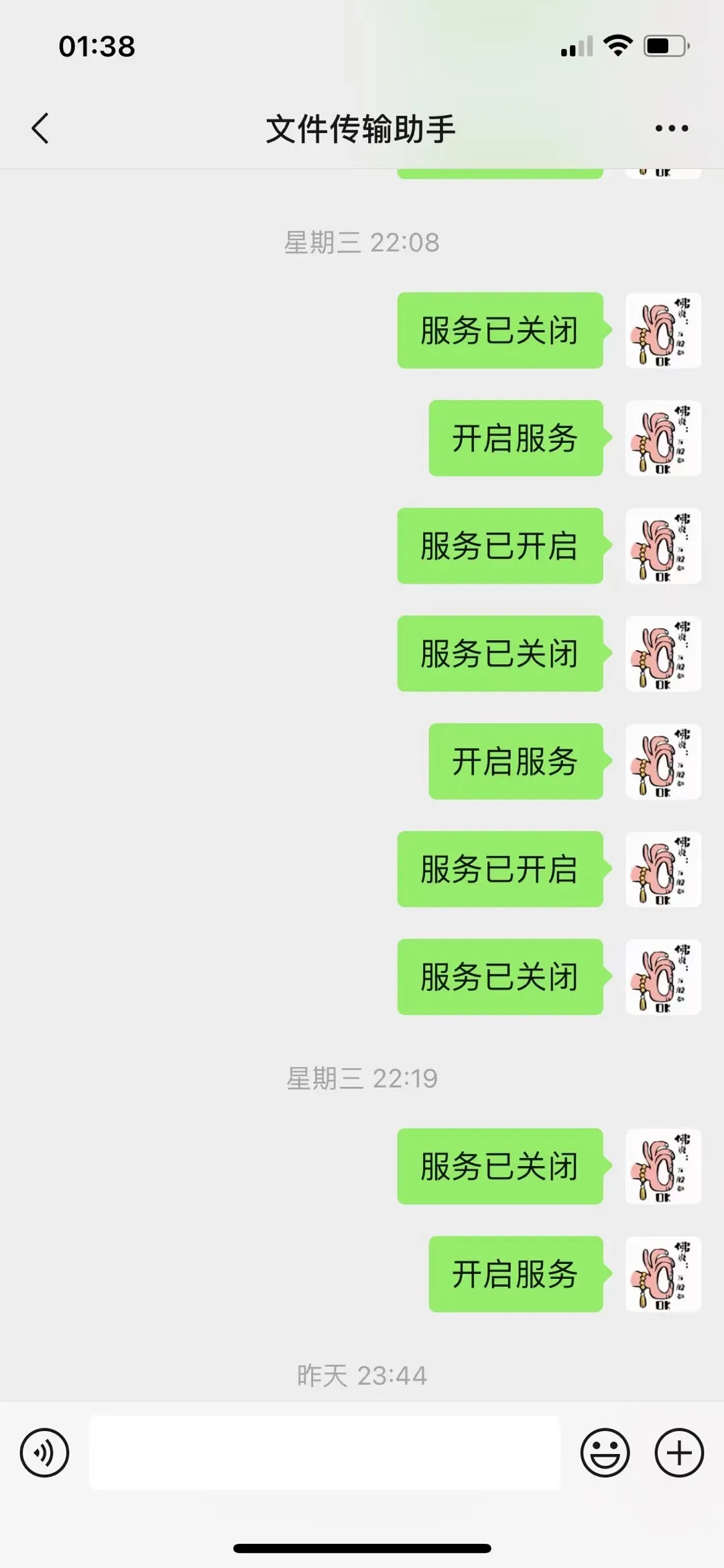 通过与手机文件传输对话,实现服务的开启和停止,当你需要触发一次或多次回复/转发/计算/人工等条件后需要暂时停止服务,停止后就可以通过与传输助手对话再次开启