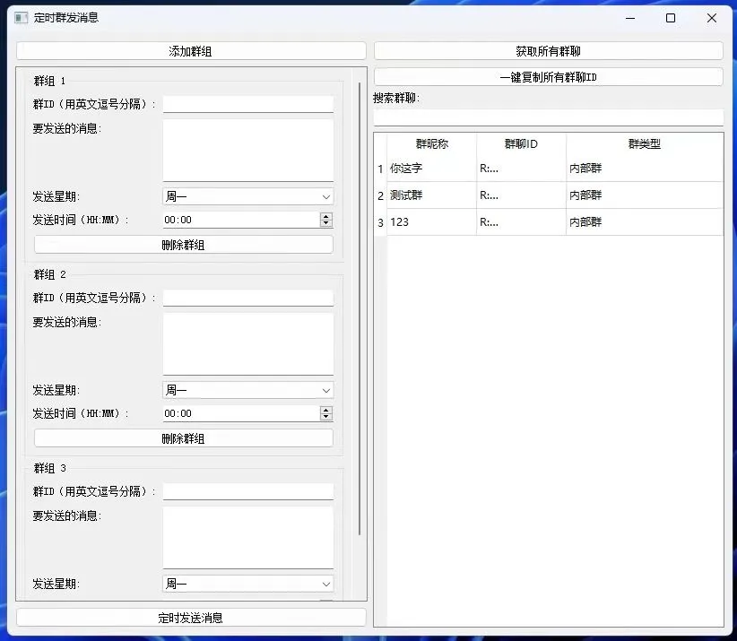 可设置多组任务,每组不重复,每组可单独设置群发时间。 一键获取外部内部所有Qun聊