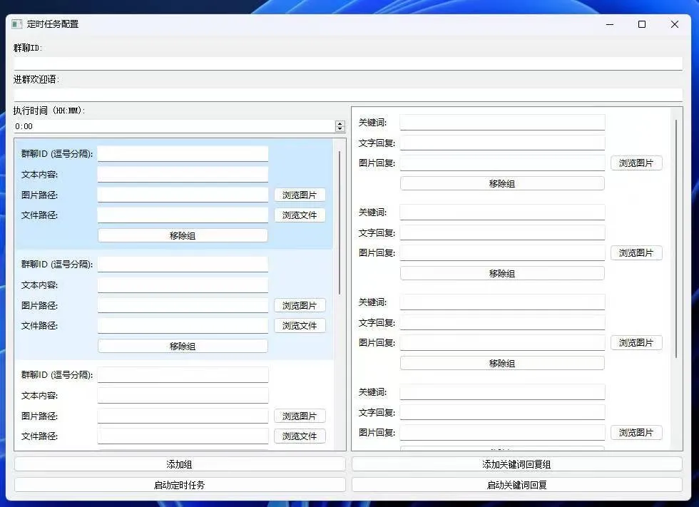 定时任务和关键词回复可以设置无数组,可以应用于无数个Qun,也不止是Qun,面向个人私聊也可以关键词回复。